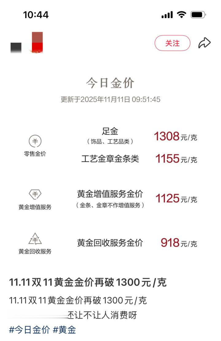 有网友吐槽,破1300元的金价,是奢饰品的金价。